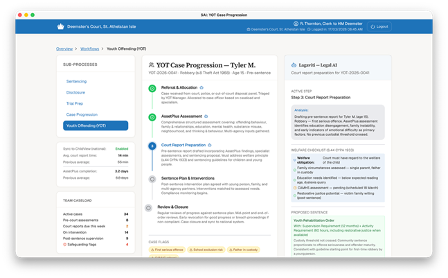 On the right, Lagaviti's welfare checklist which is citing section 44 of the Children and Young Persons Act 1933, the Sentencing Children and Young People guideline, and the UN Convention on the Rights of the Child. A proposed Youth Rehabilitation Order with activity, supervision, and curfew requirements, generated from the same structured reasoning as the Crown Court workflows, but applied to a team that would never normally get access to this kind of tooling.